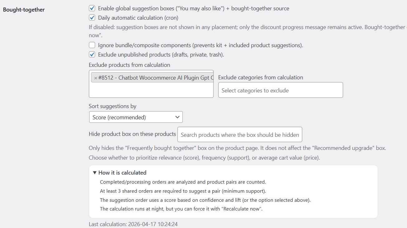 Suggested products are not random: they are calculated by analyzing your store’s real orders. The system automatically analyzes your sales history to recommend the combinations most frequently purchased by your customers.