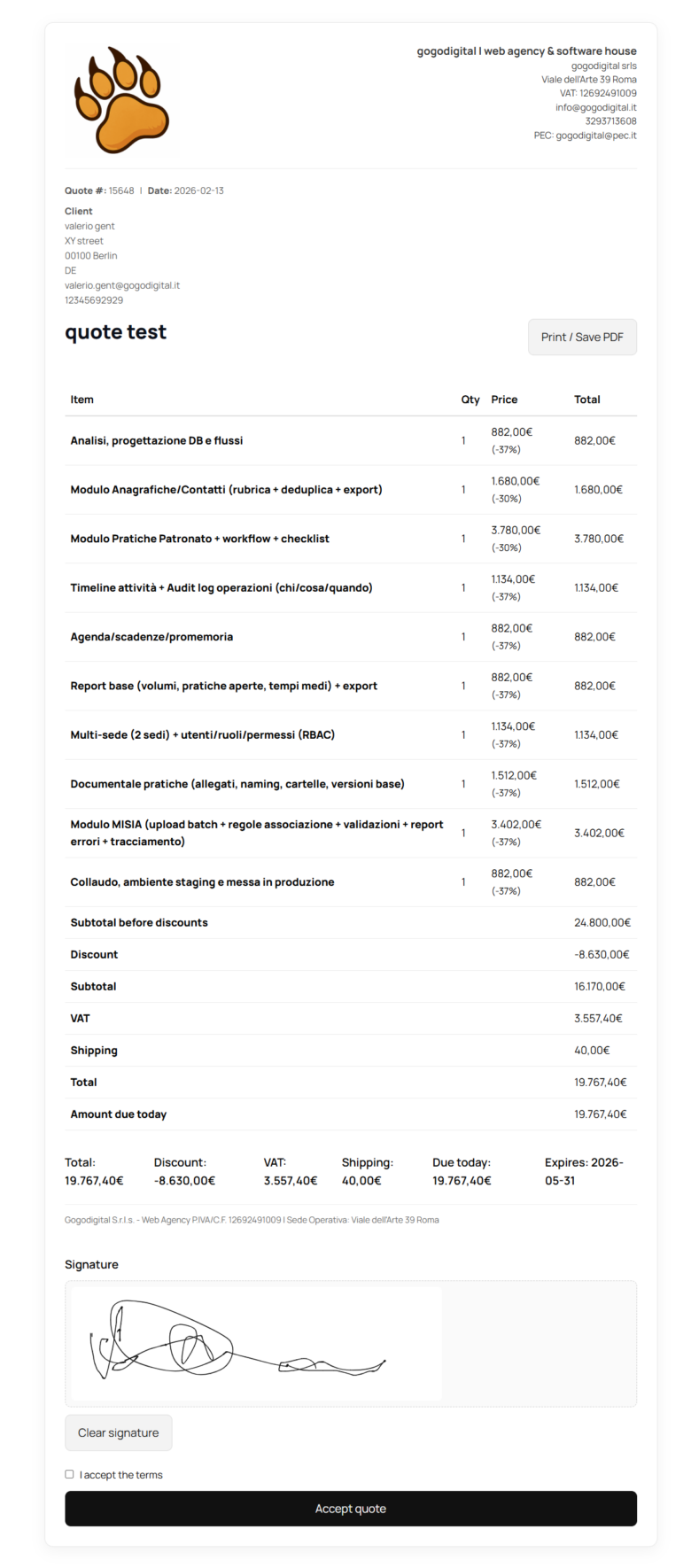 Create private WooCommerce quotes with PDF delivery, online acceptance, signatures,