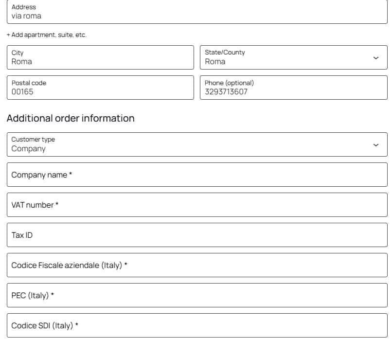 Italian invoicing fields in one checkout flow — compatible with